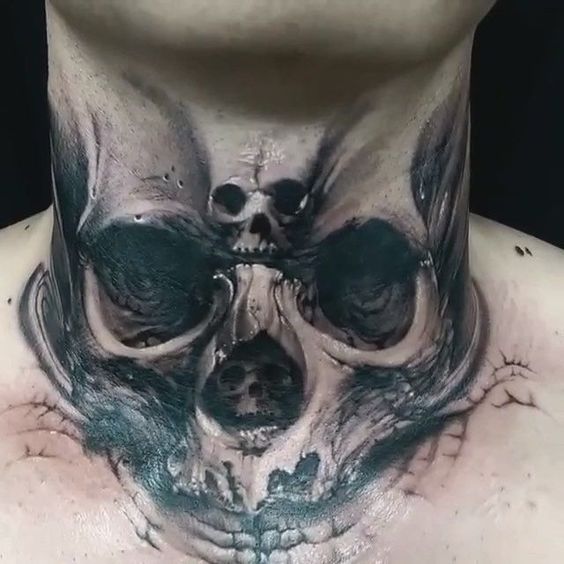 Un diseño realmente detallado, lleno de calaveras y realizado de forma que el tatuaje se funda con el cuello y que al verlo de la sensación que sale realmente del cuello, un trabajo realmente impresionante.